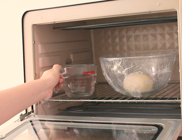 오븐에 반죽과 뜨거운 물을 넣은 컵을 넣고 오븐의 발효기능으로 40도 40분 발효해줄게요.