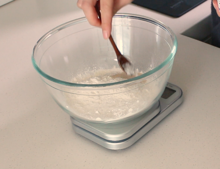 강력분에 드라이이스트와 소금을 넣고 섞어줄게요.