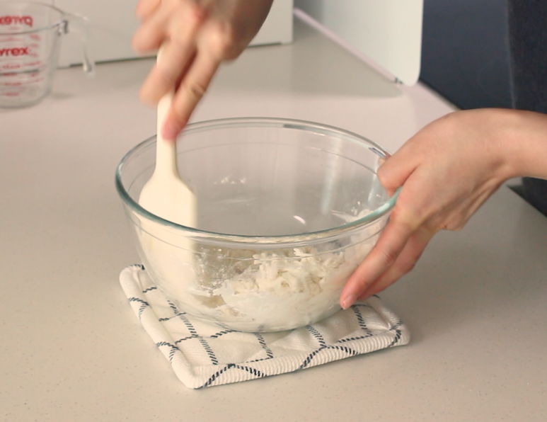 반죽을 볼에 넣고 랩을 씌워주세요.