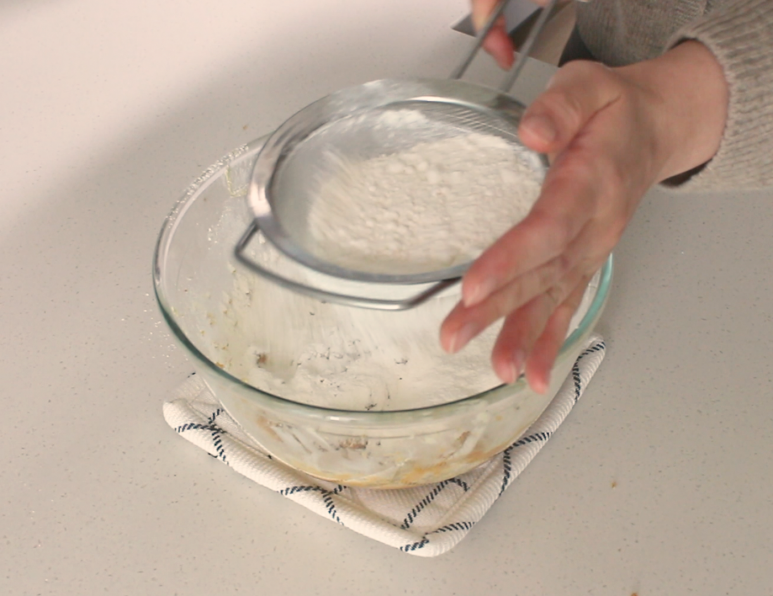 가루를 체쳐서 넣고 주걱으로 섞어줄게요.