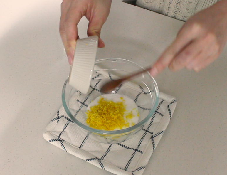 준비해둔 설탕에 레몬 제스트를 넣고 섞어 레몬 설탕을 만들어둘게요.