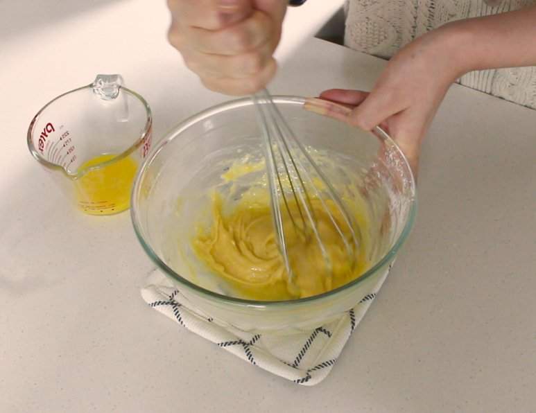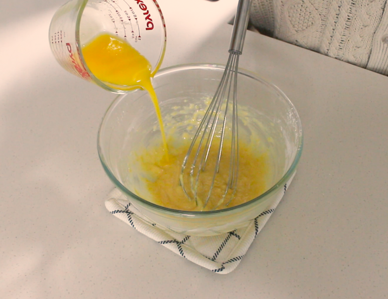 녹인 버터를 2번에 나눠서 넣고 섞어줄게요.