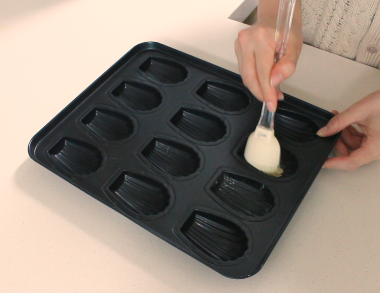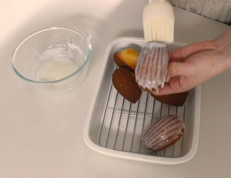 마들렌에 붓을 사용해서 레몬 아이싱을 발라줘요.