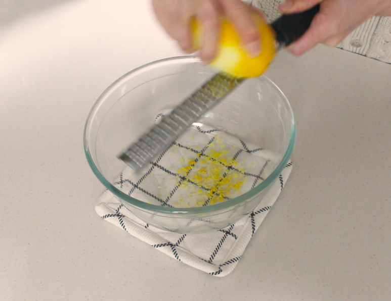 제스터를 사용해서 레몬껍질을 갈아 레몬 제스트를 만들어줘요.