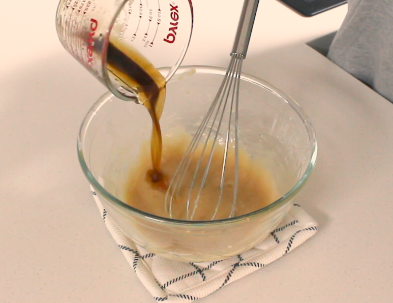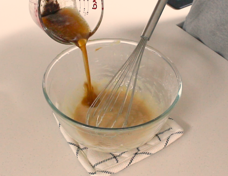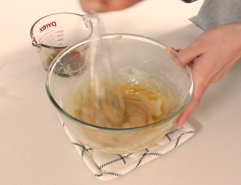 미리 마들어둔 브라운 버터를 2-3번에 나눠서 넣고 섞어주세요.