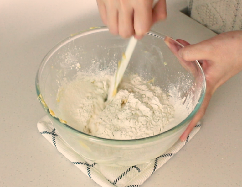 4. 가루를 체쳐서 넣고 주걱을 세워 섞어주세요.