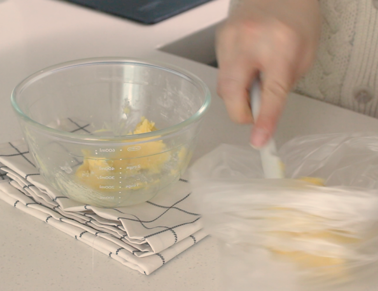 오리지널 맛 반죽은 바로 비닐에 넣어 냉장고에서 30분 굳혀줄게요.