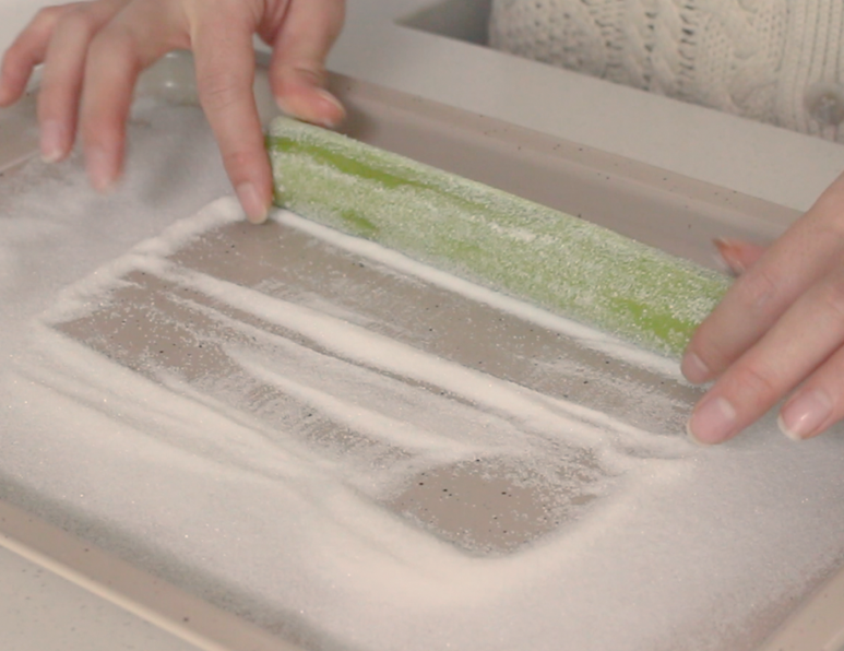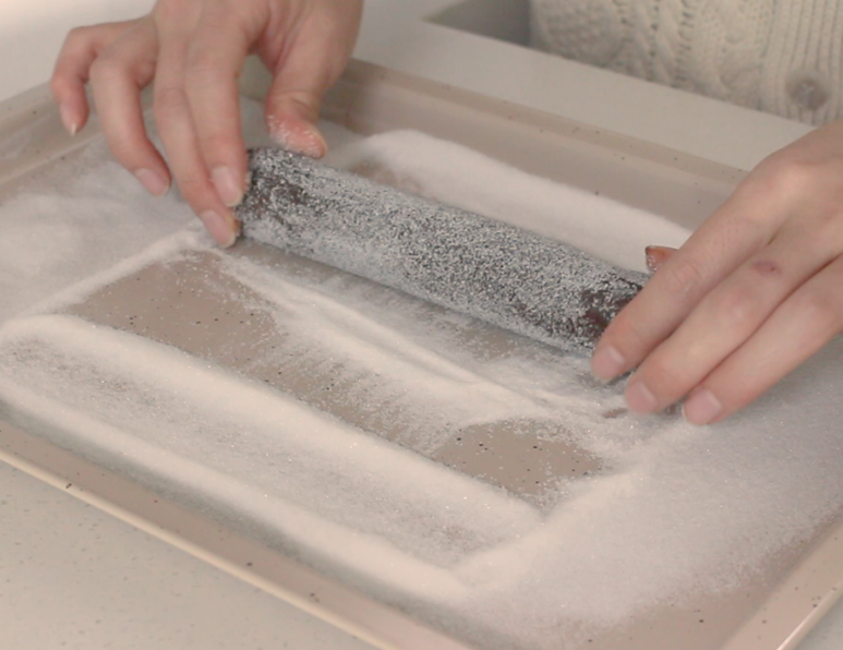 넓은 쟁반에 설탕을 깔고 반죽에 설탕을 묻혀줄게요.