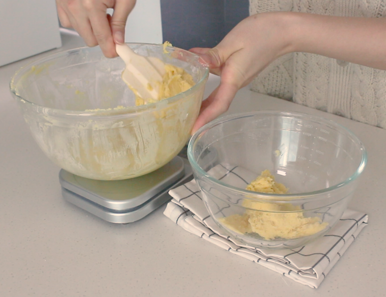 저울을 사용해서 반죽을 3등분 해줄게요.
