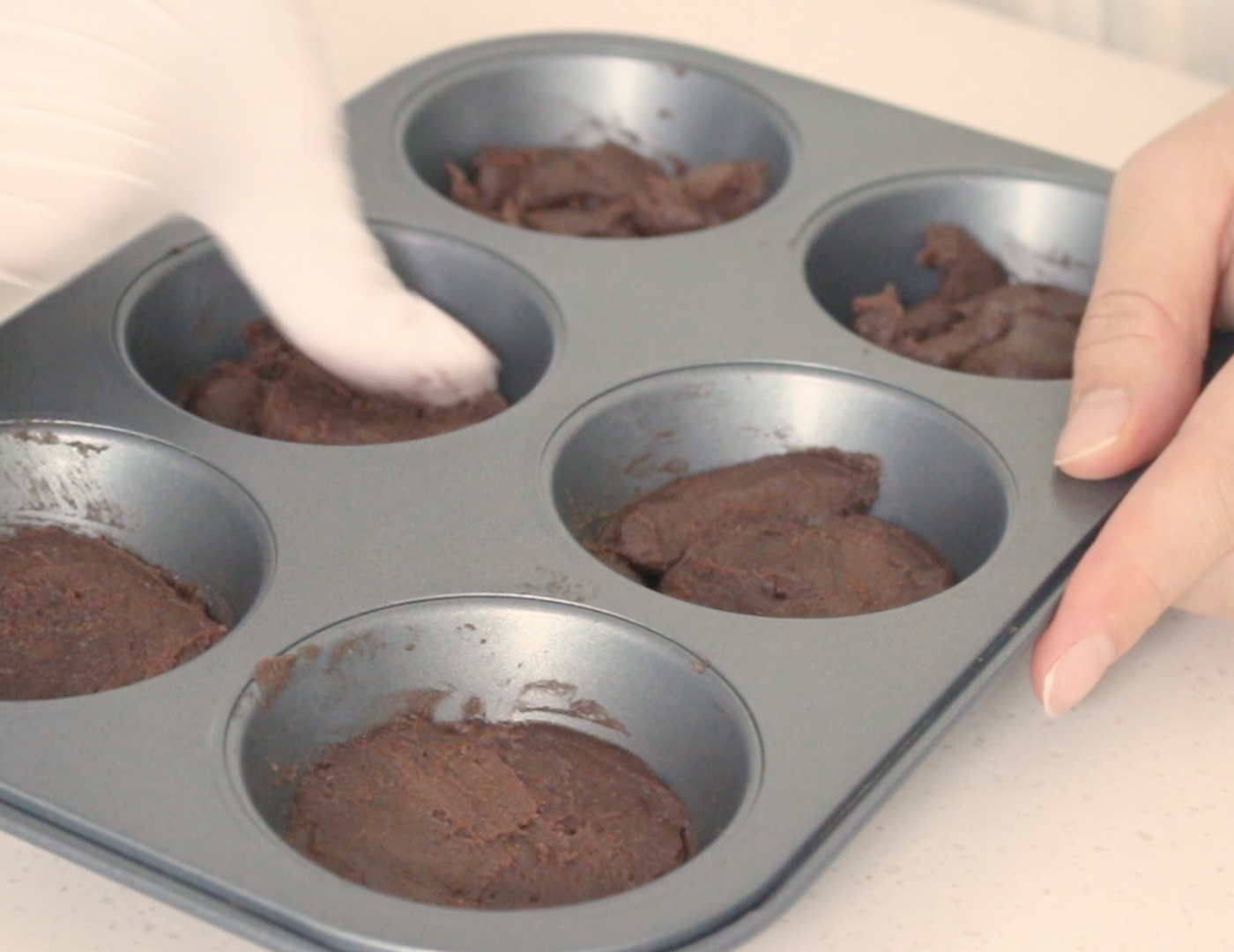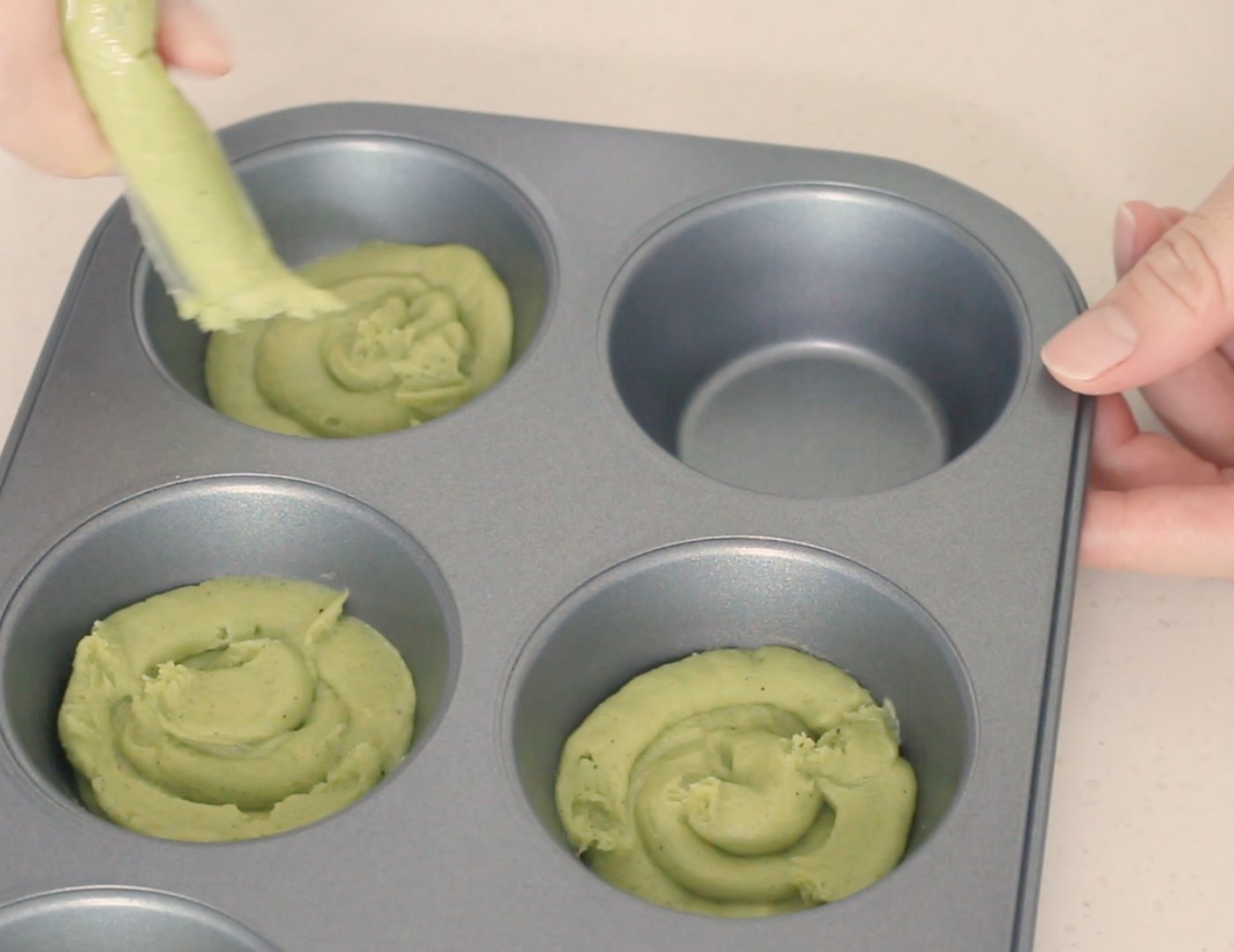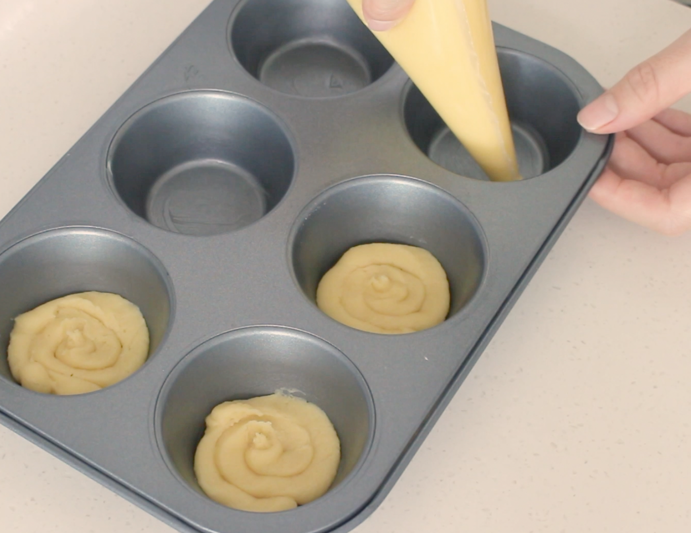 짤주머니에 담은 반죽을 머핀틀에 팬닝해준후 냉장고에 30분 이상 휴지해줄게요.