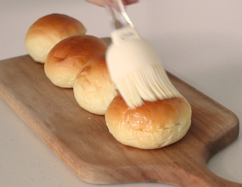 버터를 녹여 빵 위에 붓으로 발라줄게요.